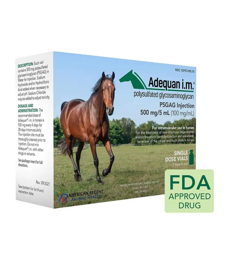 Adequan Equine I.M. 500 mg/5 ml (7 x 5 ml) is a prescription injectable solution designed to treat osteoarthritis and other joint-related conditions in horses. Containing polysulfated glycosaminoglycan, this medication is administered intramuscularly to reduce inflammation in the joints, enhance joint lubrication, and support cartilage repair. It effectively alleviates pain, restores joint function, and improves mobility, making it an essential treatment for horses suffering from chronic joint pain, stiffness, and lameness. The package contains seven 5 ml vials, offering a convenient supply for ongoing treatment. Adequan is commonly recommended by veterinarians for managing conditions like arthritis, helping horses regain mobility and improve their quality of life. Proper administration by a veterinarian is essential to ensure the most effective results.