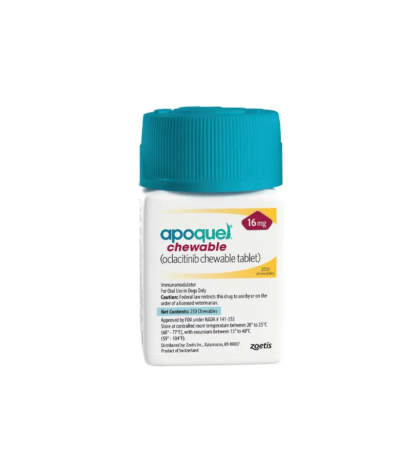 Apoquel® Chewable (oclacitinib) 16 mg tablets are a prescription medication designed to control pruritus associated with allergic dermatitis and manage atopic dermatitis in dogs aged 12 months and older. As a Janus Kinase (JAK) inhibitor, oclacitinib selectively inhibits cytokines involved in the itch and inflammatory pathways, providing targeted relief without the side effects commonly associated with steroids. Clinical studies have shown that Apoquel begins to alleviate itching within 4 hours, with complete control achieved within 24 hours. The recommended dosing regimen involves administering 0.4 to 0.6 mg/kg orally twice daily for up to 14 days, followed by once-daily maintenance dosing. Apoquel Chewable can be given with or without food. Common side effects may include vomiting, diarrhea, decreased appetite, and lethargy. Due to its immunomodulatory effects, Apoquel should not be used in dogs with serious infections or those under 12 months of age. Regular veterinary monitoring is advised to ensure safety and efficacy during treatment.