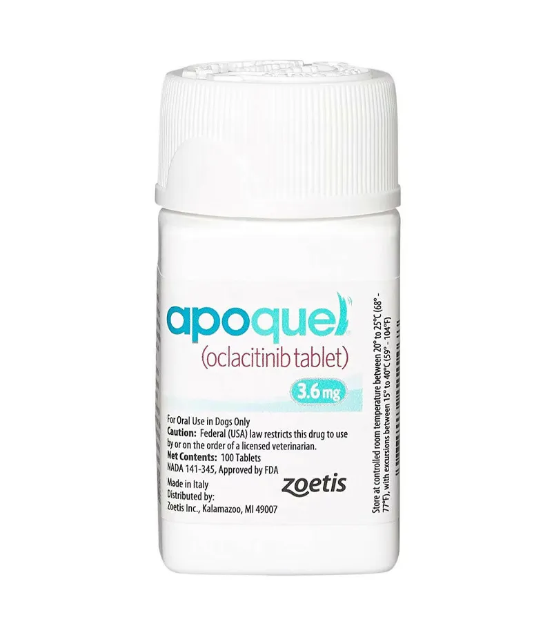 Apoquel® (oclacitinib) 3.6 mg tablets are a prescription medication designed to control pruritus associated with allergic dermatitis and manage atopic dermatitis in dogs aged 12 months and older. As a Janus Kinase (JAK) inhibitor, oclacitinib selectively inhibits cytokines involved in the itch and inflammatory pathways, providing targeted relief without the side effects commonly associated with steroids. Clinical studies have shown that Apoquel begins to alleviate itching within 4 hours, with complete control achieved within 24 hours. The recommended dosing regimen involves administering 0.4 to 0.6 mg/kg orally twice daily for up to 14 days, followed by once-daily maintenance dosing. Apoquel can be given with or without food. Common side effects may include vomiting, diarrhea, decreased appetite, and lethargy. Due to its immunomodulatory effects, Apoquel should not be used in dogs with serious infections or those under 12 months of age. Regular veterinary monitoring is advised to ensure safety and efficacy during treatment.