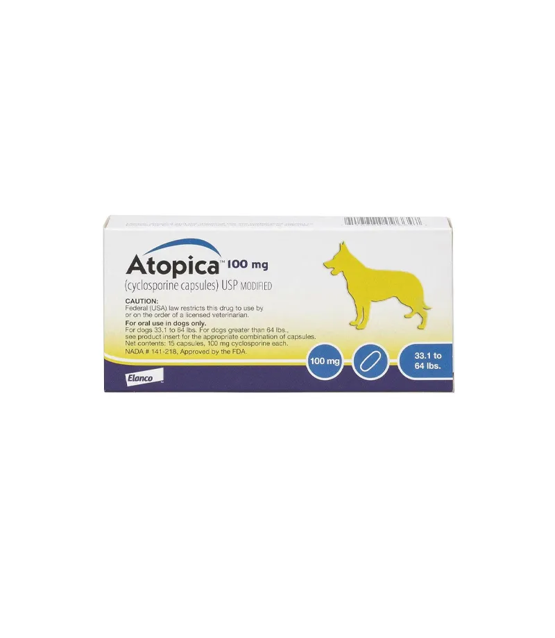 $117.38 $119.00Atopica® (cyclosporine modified) 100 mg capsules are a prescription medication designed to manage atopic dermatitis in dogs weighing at least 4 lbs. This immunosuppressant targets the underlying causes of skin inflammation and itching, offering an effective alternative to steroids. Administered once daily, Atopica helps restore skin health and comfort in affected dogs.