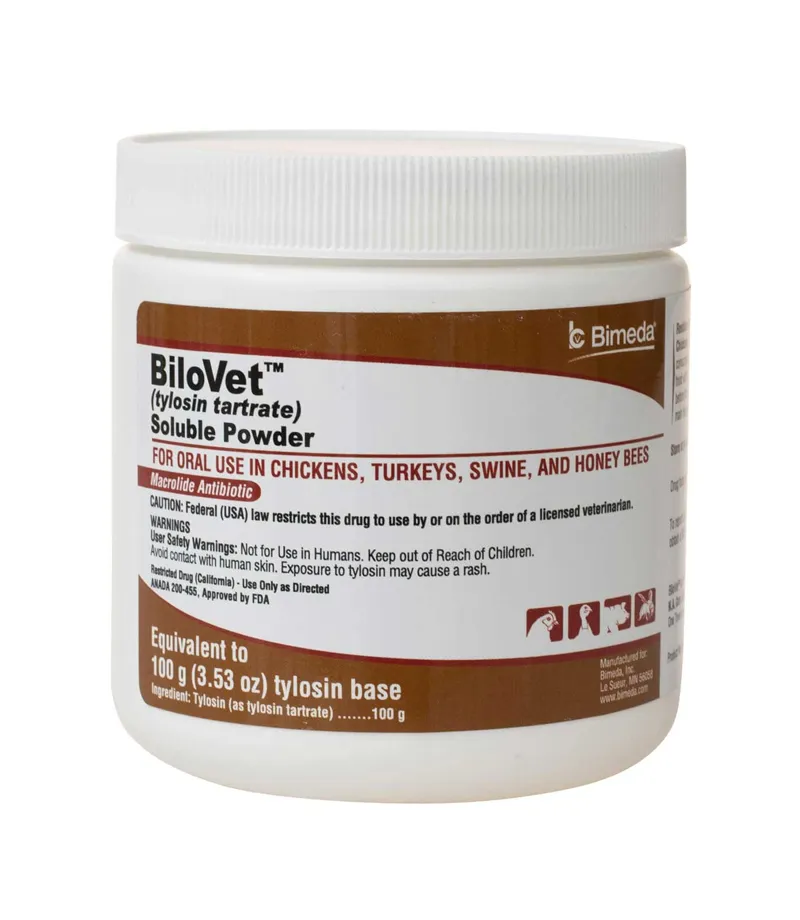 BiloVet® Soluble Powder contains tylosin tartrate, a macrolide antibiotic, and is indicated for oral use in chickens, turkeys, swine, and honey bees. In chickens, it aids in treating chronic respiratory disease (CRD) associated with Mycoplasma gallisepticum and Mycoplasma synoviae. In turkeys, it reduces the severity of infectious sinusitis caused by Mycoplasma gallisepticum. For swine, BiloVet® is used to treat and control swine dysentery associated with Brachyspira hyodysenteriae and to control porcine proliferative enteropathies (PPE) associated with Lawsonia intracellularis. In honey bees, it controls American Foulbrood caused by Paenibacillus larvae. The powder is mixed with drinking water, and dosing varies by species and condition. Fresh medicated water should be prepared every 3 days, and all treated animals should consume an adequate amount to receive a therapeutic dose. It is not for use in egg-producing layers or honey production during treatment. Always follow veterinary guidance when administering this product.