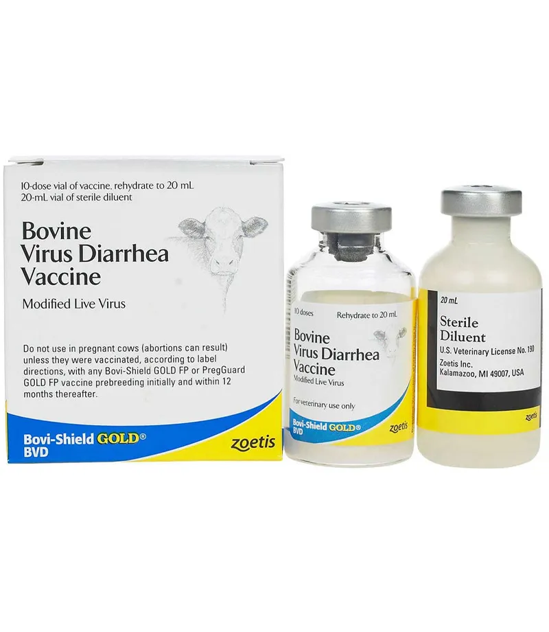 Bovi-Shield® GOLD BVD, developed by Zoetis, is a freeze-dried, modified-live virus vaccine formulated to protect healthy cattle against respiratory disease and viremia caused by BVD virus Types 1 and 2. When administered subcutaneously, it provides a demonstrated duration of immunity of at least 9 months. This vaccine is safe for use in pregnant cows and calves nursing pregnant cows, provided the dams were vaccinated according to label directions with any Bovi-Shield GOLD FP® or PregGuard® GOLD FP vaccine within the past 12 months. Calves vaccinated before 6 months should be revaccinated after 6 months or at weaning. Annual revaccination is recommended. The vaccine requires reconstitution with the provided sterile diluent before administration. Do not vaccinate within 21 days before slaughter. Store at 2°–7°C (35°–45°F) and avoid freezing.