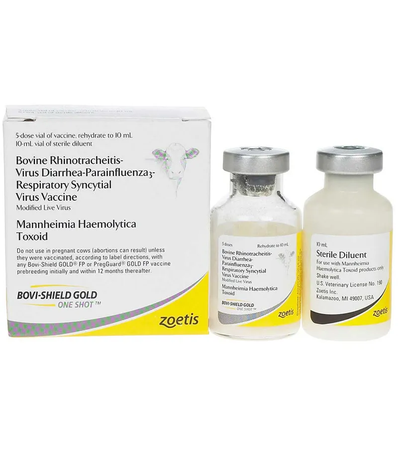 Bovi-Shield® GOLD One Shot™, developed by Zoetis, is a combination vaccine designed to protect healthy cattle against key respiratory pathogens: infectious bovine rhinotracheitis (IBR), bovine viral diarrhea (BVD) Types 1 and 2, parainfluenza3 (PI3), bovine respiratory syncytial virus (BRSV), and pneumonia caused by Mannheimia haemolytica. This modified-live virus vaccine requires reconstitution with the provided sterile diluent before administration. A 2 mL subcutaneous dose offers at least 9 months of immunity against IBR and BVD Types 1 and 2. It is safe for use in pregnant cows and calves nursing pregnant cows, provided the dams were vaccinated according to label directions with any Bovi-Shield GOLD FP® or PregGuard® GOLD FP vaccine within the past 12 months. Calves vaccinated before 6 months should be revaccinated after 6 months or at weaning. Annual revaccination is recommended. Do not vaccinate within 21 days before slaughter. Store at 2°–8°C and avoid freezing.