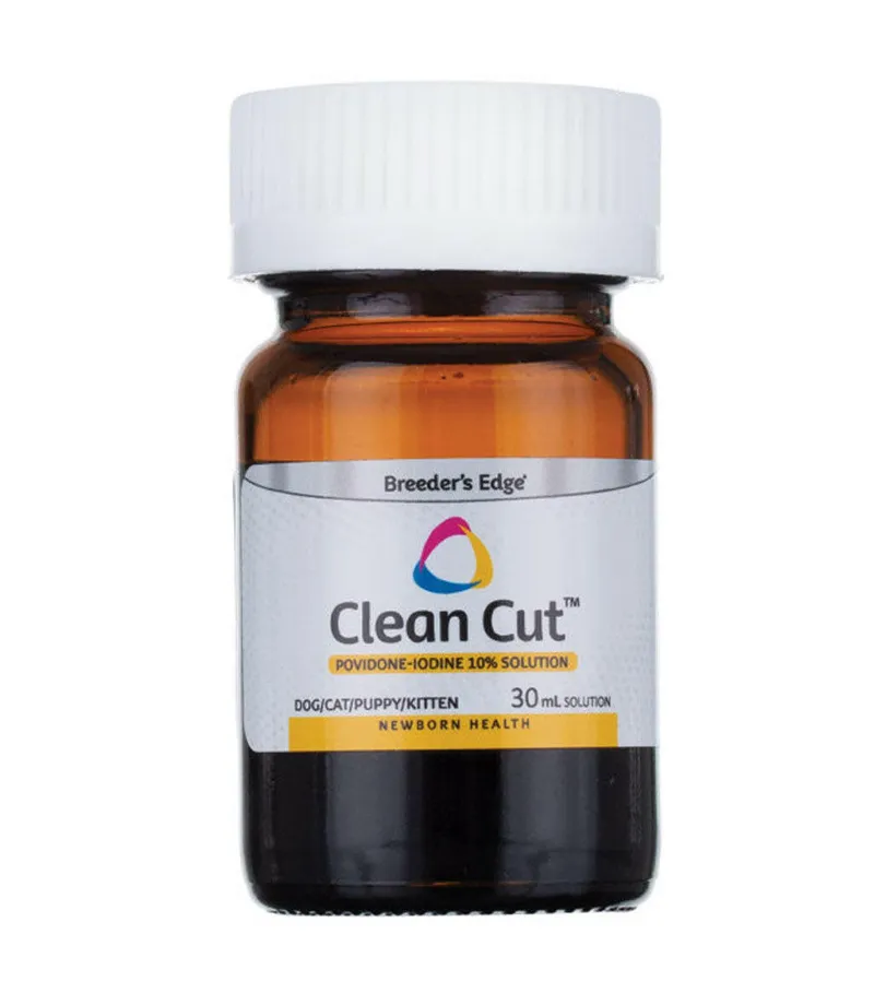 $6.99 $8.00Breeder's Edge Clean Cut Iodine is a veterinary-formulated 10% povidone-iodine antiseptic solution for dogs, cats, puppies, and kittens. It effectively disinfects and protects the umbilical cord area in newborns, reducing the risk of infections and promoting faster healing. The non-staining formula ensures no discoloration on light-colored fur or skin.