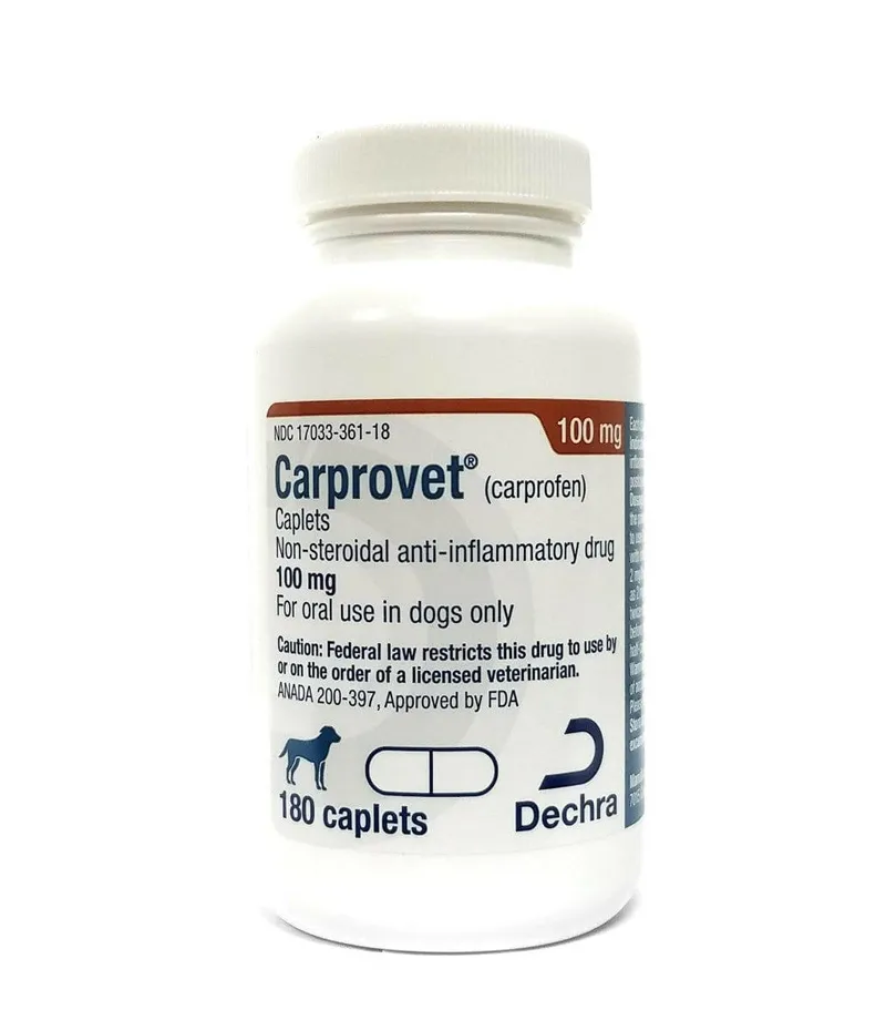 Carprovet (Carprofen) 100mg Caplets are veterinary-prescribed NSAIDs designed to manage pain and inflammation associated with osteoarthritis and postoperative recovery in dogs. Osteoarthritis, a degenerative joint disease, leads to stiffness, discomfort, and reduced mobility. Carprovet works by inhibiting cyclooxygenase enzymes (COX-1 and COX-2), which play key roles in the inflammatory process. The typical dosage is 2 mg per pound (4.4 mg/kg) of body weight, administered once daily or divided into two doses of 1 mg per pound (2.2 mg/kg) twice daily. For postoperative pain, administer approximately two hours before the procedure. Regular veterinary consultations are essential to monitor the dog's response and adjust the dosage as needed. Potential side effects include gastrointestinal issues, changes in appetite, and lethargy. Immediate veterinary attention is recommended if any adverse reactions are observed.