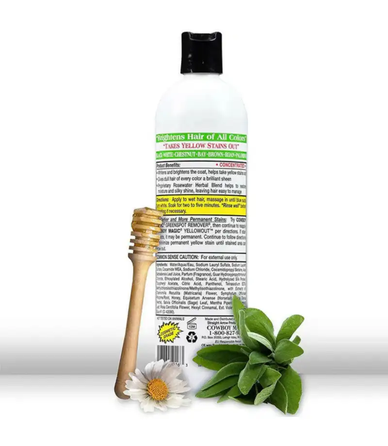 $14.99 $15.50Cowboy Magic Shine In YellowOut Shampoo for Pets enhances the natural shine of your pet’s coat while neutralizing yellow tones. Formulated with a special blend of ingredients, it brightens white and light-colored coats, leaving them vibrant, soft, and manageable. Ideal for dogs and cats with pale or light-colored fur, this gentle formula promotes a clean, fresh, and shiny finish.