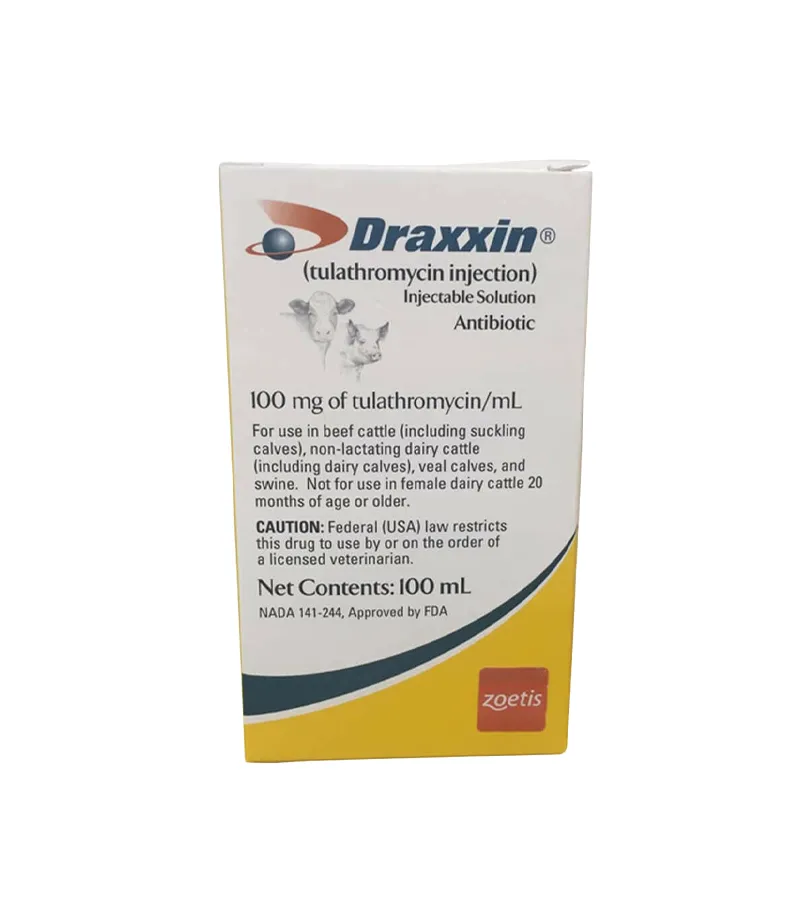 Draxxin (tulathromycin) Injection 100 mg/mL is a broad-spectrum macrolide antibiotic designed to treat and control respiratory diseases in livestock. In cattle, it effectively addresses bovine respiratory disease (BRD) caused by Mannheimia haemolytica, Pasteurella multocida, Histophilus somni, and Mycoplasma bovis. It also treats infectious bovine keratoconjunctivitis (IBK) associated with Moraxella bovis and foot rot due to Fusobacterium necrophorum and Porphyromonas levii. In swine, Draxxin is indicated for swine respiratory disease (SRD) caused by pathogens such as Actinobacillus pleuropneumoniae, Pasteurella multocida, Bordetella bronchiseptica, Haemophilus parasuis, and Mycoplasma hyopneumoniae. Administered as a single subcutaneous injection in cattle or intramuscular injection in swine at a dosage of 2.5 mg/kg body weight (1.1 mL per 100 lbs), Draxxin offers up to 14 days of therapeutic levels in cattle, minimizing the need for repeated handling. Withdrawal times are 18 days for cattle and 5 days for swine before slaughter. Draxxin is not approved for use in female dairy cattle 20 months of age or older or in calves intended for veal.