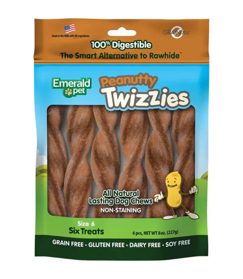 $15.00 $17.00Emerald Pet Peanutty Twizzies Grain-Free Dog Treats (6 count) are delicious, peanut butter-flavored chews that are grain-free and made with natural ingredients. These twisted treats are perfect for satisfying your dog’s chewing needs while providing a healthy, tasty reward.