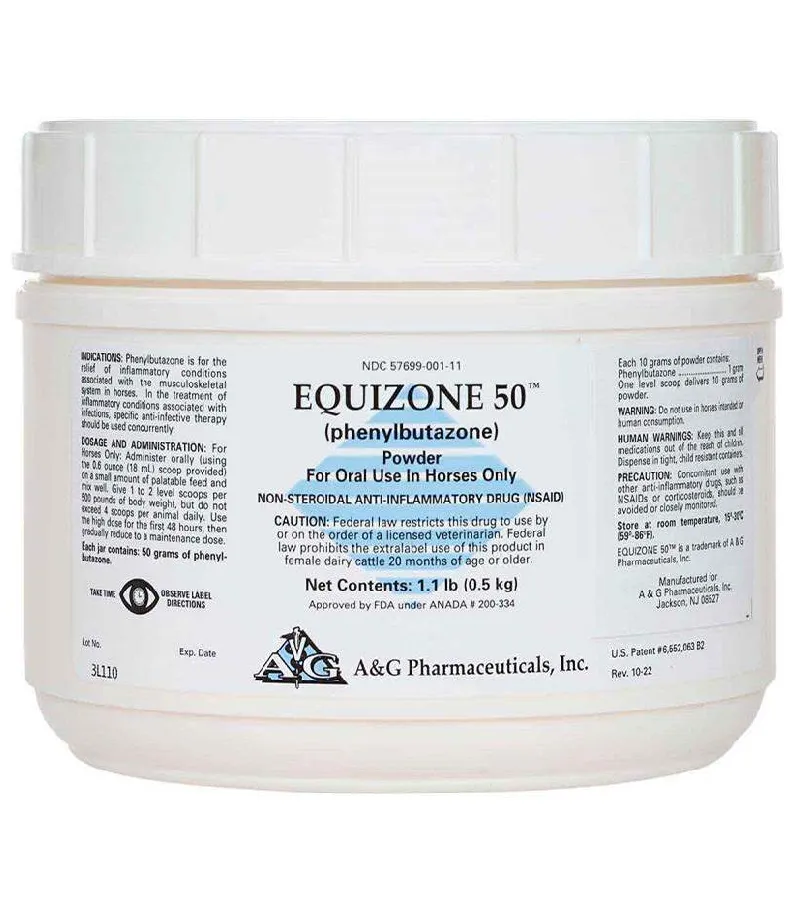 Equizone Phenylbutazone Powder is a non-steroidal anti-inflammatory drug (NSAID) designed for horses to manage pain and inflammation. Containing phenylbutazone, this powder is highly effective in treating conditions such as arthritis, soft tissue injuries, and musculoskeletal pain, as well as post-surgical recovery. It works by inhibiting the enzymes responsible for inflammation, providing significant pain relief and improving mobility. The powder form allows for easy administration, as it can be mixed with the horse's feed for convenient dosing. Equizone Phenylbutazone Powder is an essential tool in managing chronic pain and discomfort in horses, helping them return to normal activity with reduced pain and increased comfort. Always follow the recommended dosage and consult with a veterinarian for proper use.