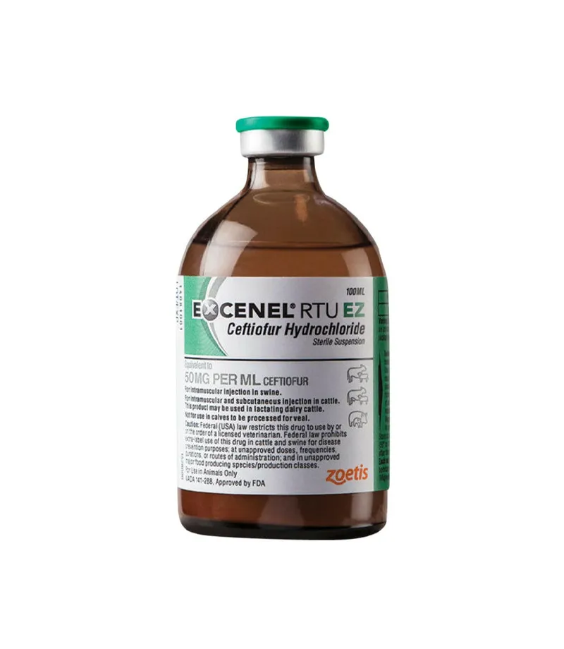 Excenel RTU EZ 50 mg/mL Injection is a broad-spectrum cephalosporin antibiotic formulated for cattle and swine. In cattle, it's indicated for treating bovine respiratory disease (BRD) caused by Mannheimia haemolytica, Pasteurella multocida, and Histophilus somni; foot rot associated with Fusobacterium necrophorum and Bacteroides melaninogenicus; and acute postpartum metritis within 0–14 days post-calving. In swine, it's used for swine respiratory disease (SRD) linked to Actinobacillus pleuropneumoniae, Pasteurella multocida, Salmonella choleraesuis, and Streptococcus suis.