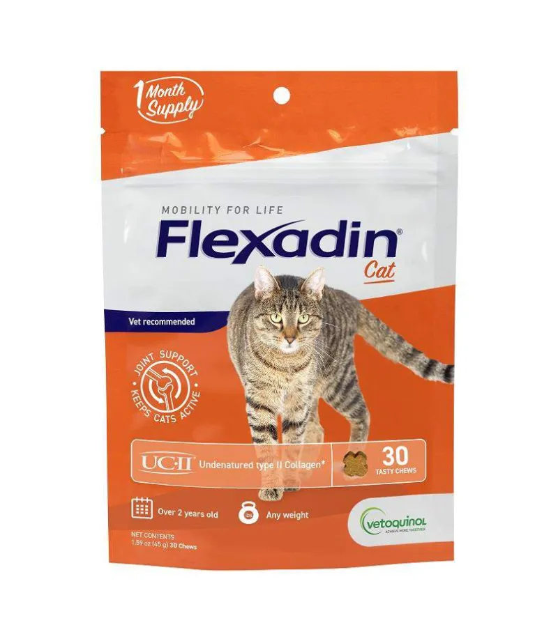 $15.00 $30.00Flexadin Cat, 30 Chews is a joint supplement designed to support the joint health and mobility of cats. These tasty chews contain Glucosamine, Chondroitin, and Omega-3 fatty acids, helping to maintain healthy cartilage, reduce inflammation, and promote overall joint function.