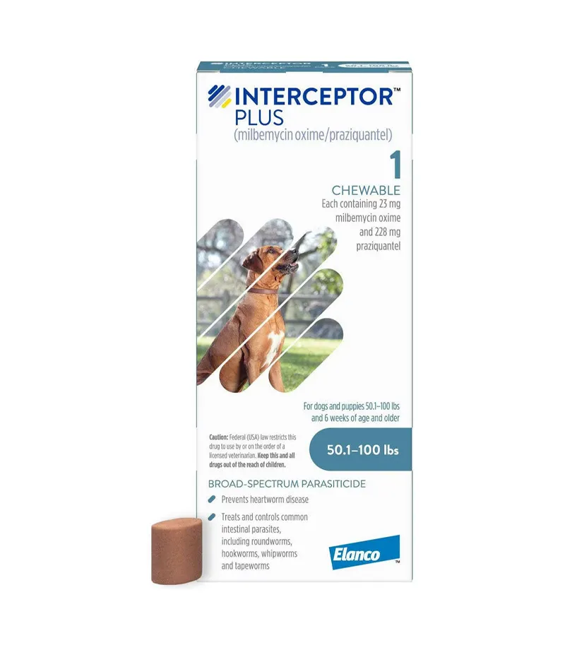 $13.98 $14.98Interceptor® Plus Chew for Large Dogs (50.1–100 lbs) is a monthly chicken-flavored chewable tablet that provides comprehensive protection against heartworm disease and treats and controls adult hookworm, roundworm, whipworm, and tapeworm infections. Each chew contains 23 mg of milbemycin oxime and 228 mg of praziquantel, ensuring effective parasite control for dogs aged 6 weeks.