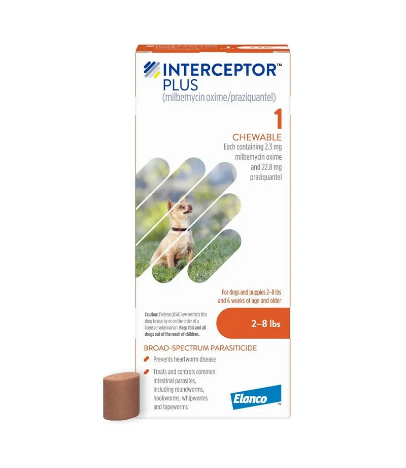 $11.48 $12.48Interceptor® Plus Chew for Puppies (2–8 lbs, Orange Box) is a monthly, chicken-flavored chewable tablet that provides comprehensive protection against heartworms, roundworms, hookworms, whipworms, and tapeworms. Suitable for puppies aged 6 weeks and older, weighing at least 2 lbs, it ensures your young dog stays healthy and parasite-free.