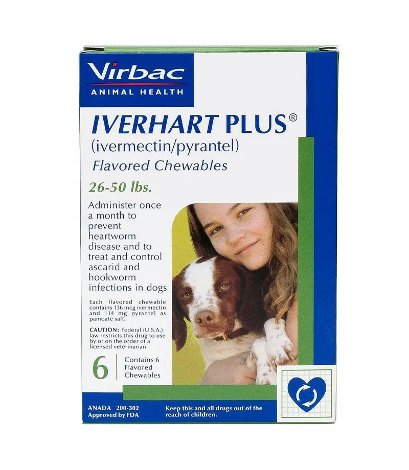 $6.45 $7.45Iverhart Plus Chewable Tablets for Dogs (26–50 lbs) offer monthly protection against heartworm disease and treat roundworm and hookworm infections. Each pork liver–flavored chewable contains 136 mcg of ivermectin and 114 mg of pyrantel pamoate, ensuring effective parasite control for dogs aged 6 weeks and older.