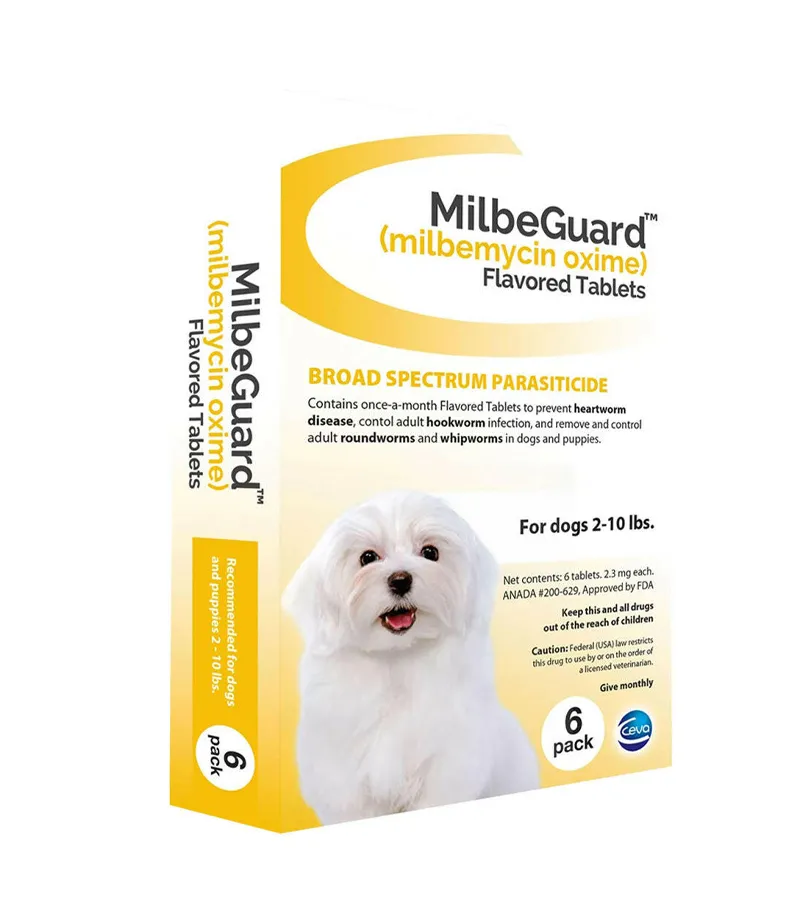 $4.99 $4.00MilbeGuard® Flavored Tablets for Dogs (2–10 lbs) are monthly, beef-flavored chewables that prevent heartworm disease and treat common intestinal parasites. Each tablet contains 2.3 mg of milbemycin oxime, suitable for dogs aged 4 weeks and older. These palatable tablets ensure comprehensive parasite control for your small dog.