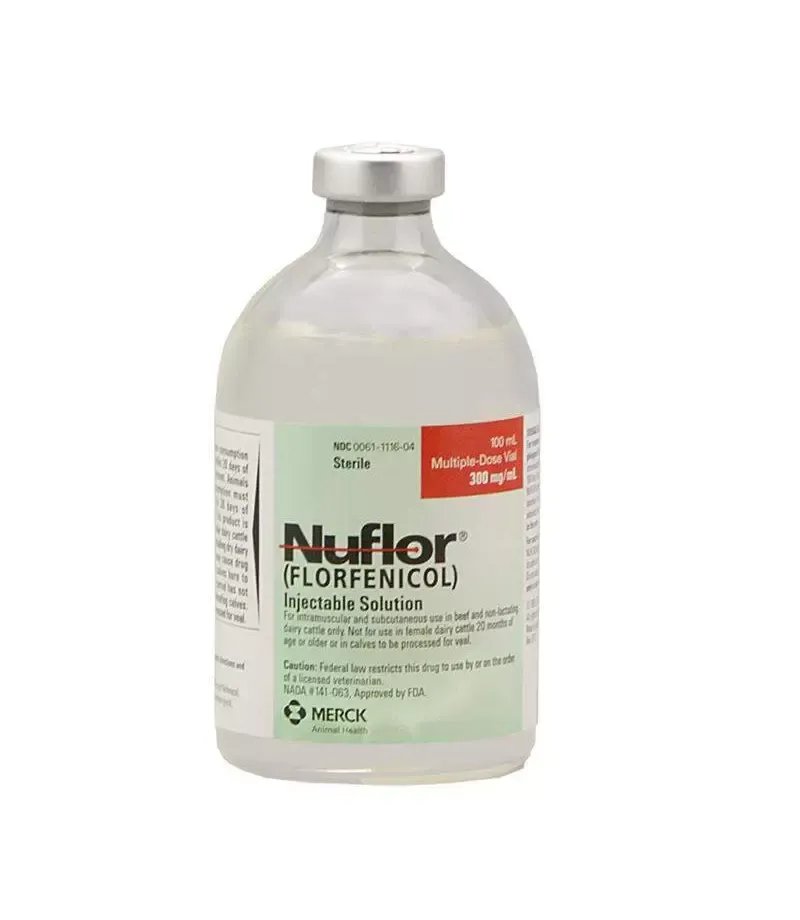 Nuflor 300 mg/ml is an injectable antibiotic containing Florfenicol, a broad-spectrum antimicrobial agent used to treat a range of bacterial infections in livestock, including cattle, swine, and sheep. It is especially effective in treating respiratory diseases such as pneumonia caused by Mannheimia haemolytica, Pasteurella multocida, and other pathogens. Nuflor helps reduce infection severity, improve recovery time, and prevent complications associated with bacterial infections. Its long-acting formula provides sustained therapeutic effects, reducing the need for frequent injections. Always use Nuflor under veterinary supervision to ensure proper dosage and treatment administration.
