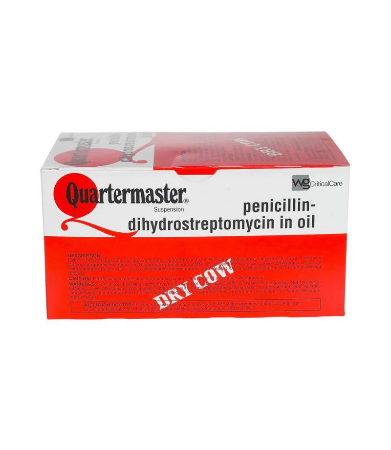 Quartermaster is a highly effective intramammary antibiotic suspension containing two active ingredients: Procaine Penicillin G and Dihydrostreptomycin Sulfate. It is specifically formulated to treat and control mastitis in dairy cows caused by a range of bacteria, including Streptococcus agalactiae and Staphylococcus aureus. Quartermaster can be used both during lactation and the dry period, helping to clear existing infections and prevent new ones. Administered directly into the udder via the teat canal, it works to reduce inflammation, eliminate bacterial pathogens, and promote udder health. For best results, always follow product label instructions and consult with a veterinarian for proper usage.