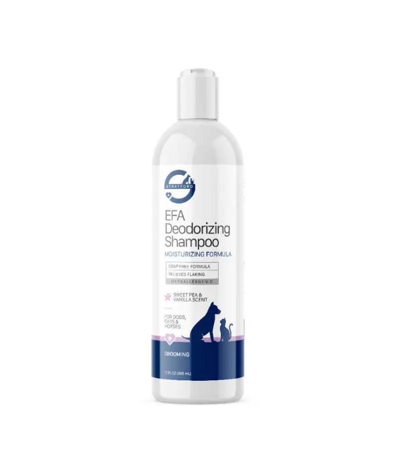 $12.99 $13.99Stratford EFA Hypoallergenic & Deodorizing Shampoo is a soap-free, gentle formula designed for pets with sensitive skin and allergies. Enriched with essential fatty acids (EFA), it helps nourish the skin, soothe irritation, and promote a healthy coat. This hypoallergenic shampoo provides deep cleansing and deodorizing, leaving your pet’s fur soft, fresh, and irritation-free.