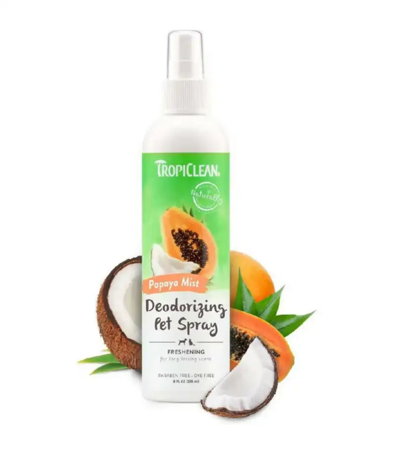 $11.99 $12.50TropiClean Papaya Mist Deodorizing Pet Spray keeps your pet smelling fresh with a tropical blend of papaya and kiwi. This gentle formula eliminates odors while conditioning the coat with aloe and botanical extracts. Safe for dogs and cats, it provides a long-lasting, refreshing scent between baths.