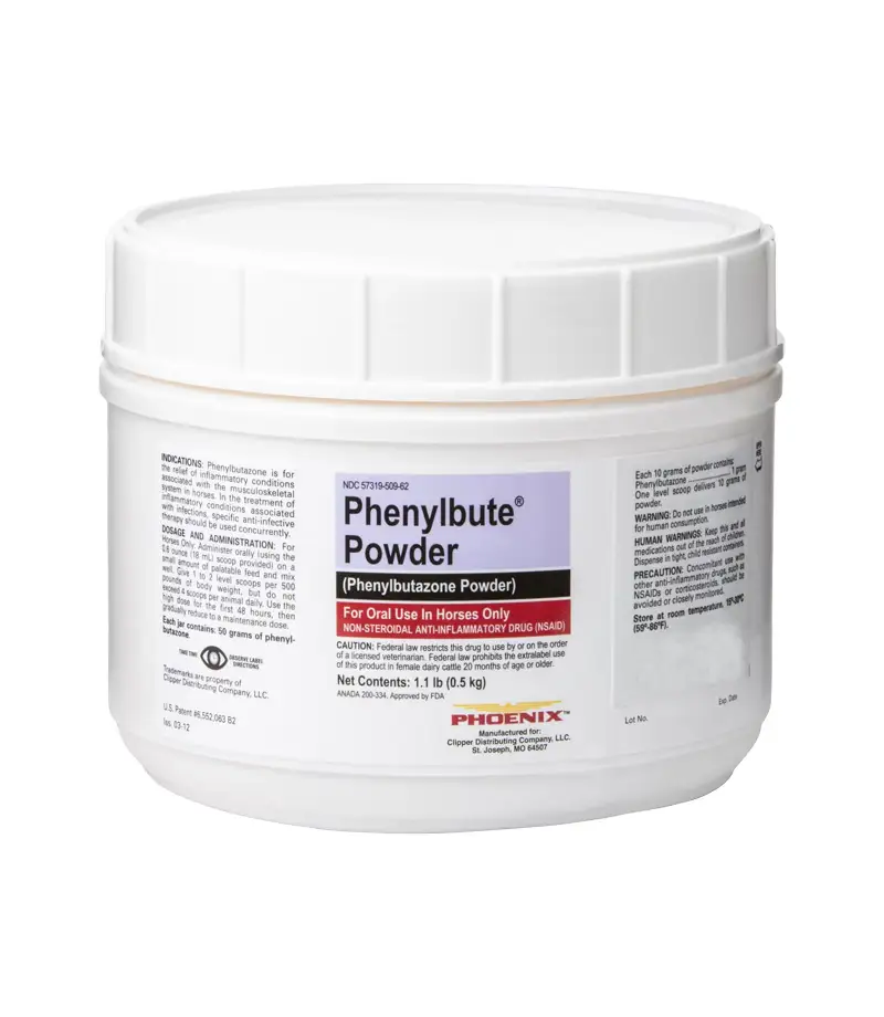 Phenylbute Powder (1.1 lbs) is a veterinary-grade non-steroidal anti-inflammatory drug (NSAID) for horses and large animals. It provides effective relief from pain, inflammation, and fever associated with musculoskeletal conditions, arthritis, and soft tissue injuries.