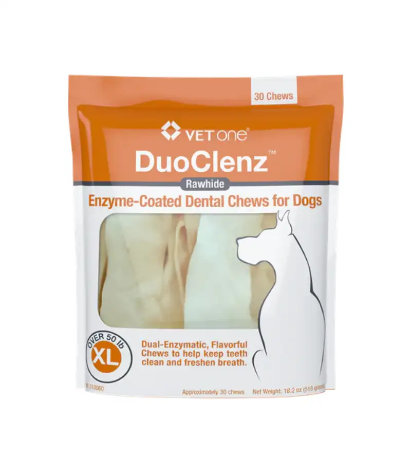 $20.97 $24.00DuoClenz Enzyme-Coated Rawhide Dental Chews for Dogs are specially designed to promote oral health while satisfying your dog's natural chewing instinct. The enzyme coating helps reduce plaque and tartar buildup, promoting cleaner teeth and fresher breath with each chew.